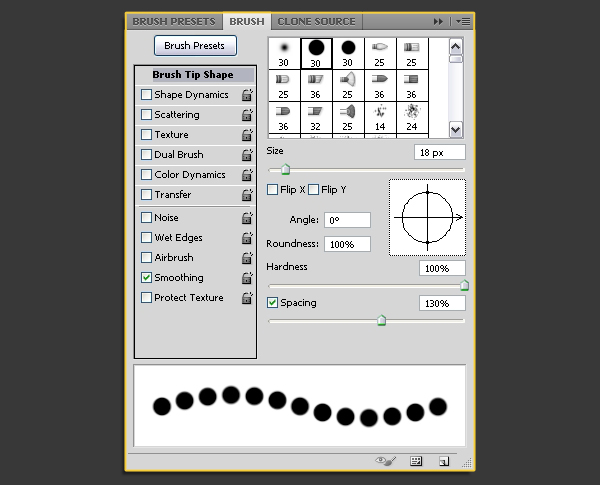 Open the Brush panel (Window -> Brush), and modify the Brush Tip Shape settings as shown below: