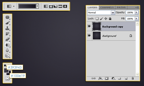 After creating your document, set the Foreground color to #393943 and the Background color to #100e19, then fill the Background with a Radial Gradient.