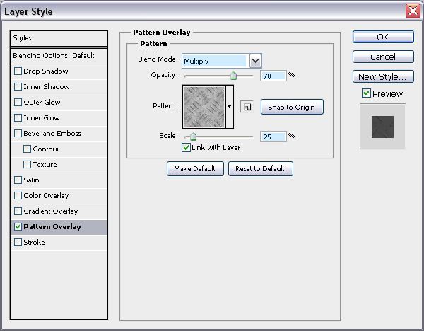 Double click the “Background copy” layer to apply a Pattern Overlay layer style. Change the Blend Mode to Multiply, the Opacity to 70%, and the Scale to 25%. Use the starnetblog_tileable_metal_texture8.jpg image from the 9 tileable metal textures pack, (it is also the second pattern in the .pat file), as the Pattern.