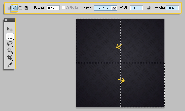 Get out the Rectangular Marquee Tool. Click the Add to Selection icon in the Options bar at the top, and set the Style to Fixed Size, then type 50% in both the Width and Height boxes. Drag your selection onto the canvas then into the bottom right corner of your canvas, do the same but in the top left corner.