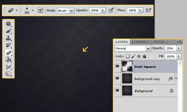Use a large soft brush to erase away the center (middle area) of the squares, so you get something like this: