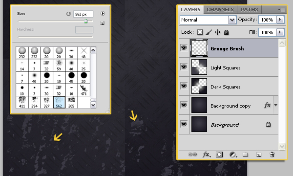 Create another new layer on top of all layers and call it “Grunge Brush”. Use the brushes from the Grungy Brush package to add a bit of grunge at the bottom of the document, using the Foreground color (#393943) as the brush color.