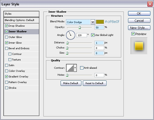 – Inner Shadow: Change the Blend Mode to Color Dodge, the color to #a98e0f, the Opacity to 50%, the Distance to 1, and the Size to 0.
