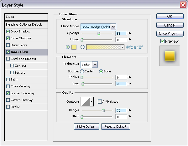 – Inner Glow: Change the Blend Mode to Linear Dodge, the Opacity to 55%, the color to #fae48f, the Size to 3, and the Range to 70%.
