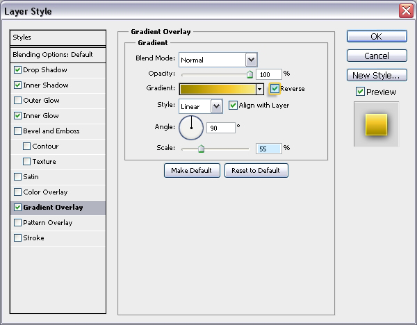 – Gradient Overlay: Check the Reverse box, and change the Scale to 55%.