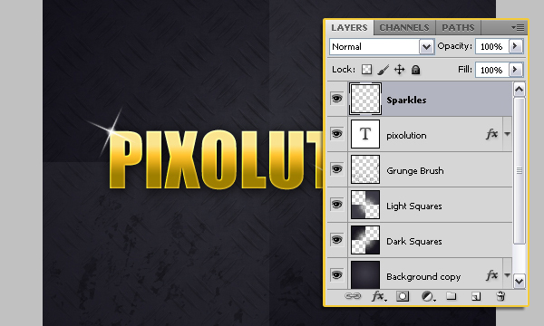 The last thing we’re going to do is adding some sparkles! So create a new layer on top of all layers, set the Foreground color to white, and use a sparkles brush to create some sparkles around your text.