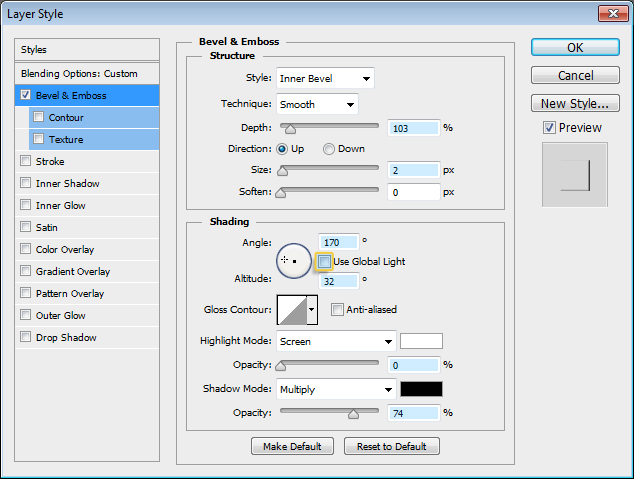 Double click the text layer to apply a Bevel and Emboss effect. Change the Depth to 103, the Size to 2, un-check the Use Global Lights box, change the Angle to 170 and the Altitude to 32, then change the Highlight Mode Opacity to 0 and the Shadow Mode Opacity to 74.