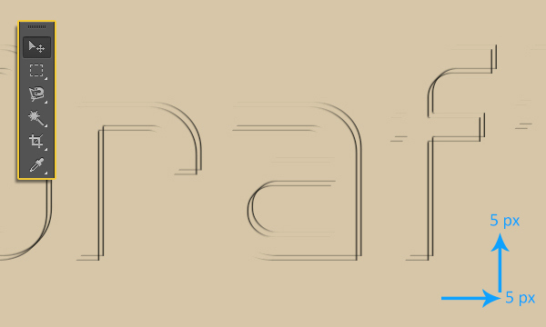 Select the Move Tool, then move the duplicated text 5 px to the left and 5 px upwards, by clicking the Left Arrow Key (on the keyboard) 5 times, then clicking the Up Arrow Key 5 times as well.