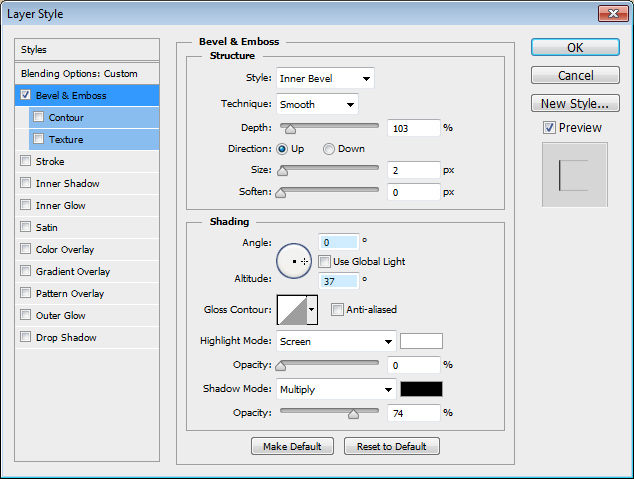 Double click the copy text layer to adjust the Bevel and Emboss values, by changing the Angle to 0, and the Altitude to 37.