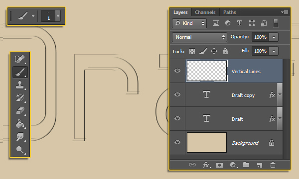 Now pick the Brush Tool, choose a hard round 1px brush tip, set the Foreground color to Black, and create a new layer on top of all layers then call it “Vertical”.