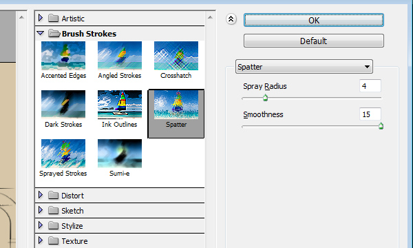 Go to Filter -> (Filter Gallery) -> Brush Strokes -> Spatter. Change the Spray Radius to 4 and the Smoothness to 15.