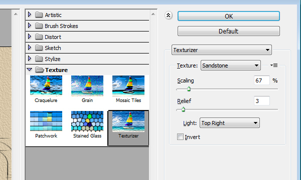 Go to Filter -> (Filter Gallery) -> Texture -> Texturizer. Choose Sandstone, set the Scaling to 67, the Relief to 3, and the Light to Top Right.