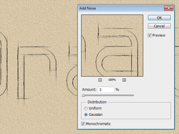 Finally, go to Filter -> Noise -> Add Noise. Change the Amount to 3, select the Gaussian button, and check the Monochromatic box.