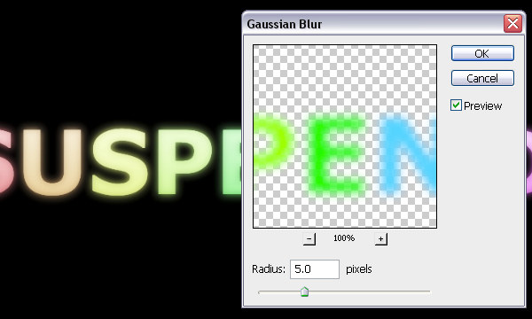 Select the original “Colored Letters” layer, then go to Filter > Blur > Gaussian Blur, and set the Raduis to 5. Do the same thing for the original “Gradient Letters” layer.