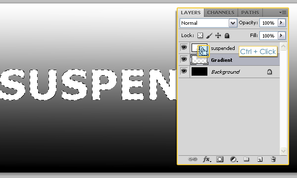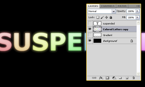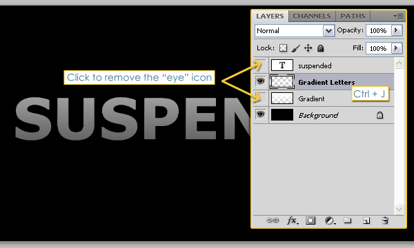 Select the “Gradient” layer so that it is the active layer, and press Ctrl + J to copy the selection and paste it in a new layer, call the new layer “Gradient Letters”. Then, click on the eye icons next to the text and “Gradient” layers to make them invisible.
