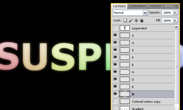 Repeat the same process for each letter. Don’t forget to select the “Colored Letters copy” layer after you press Ctrl + J each time.
