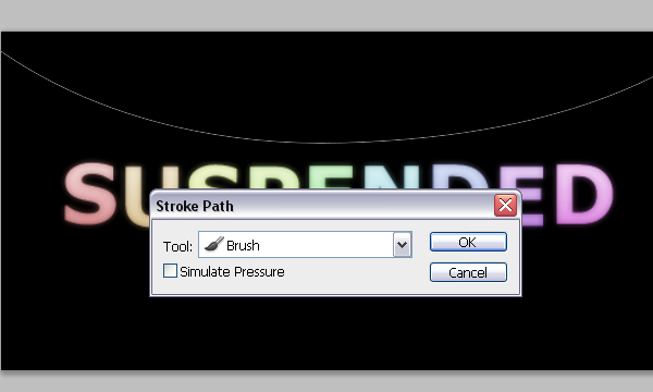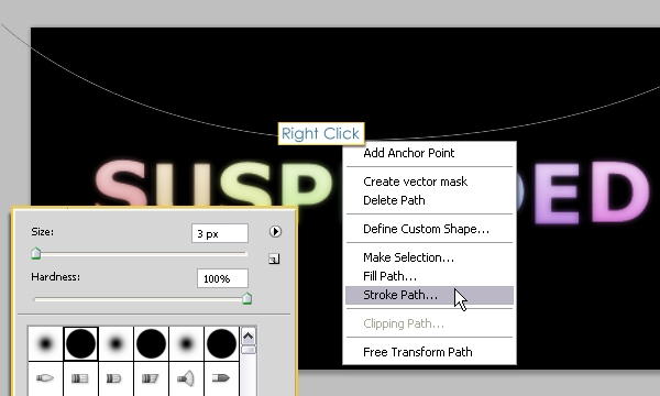 Choose a hard round brush and set its Size to 3 px. Then, pick the Pen Tool once again, right click on the path you’ve created, and choose Stroke Path.