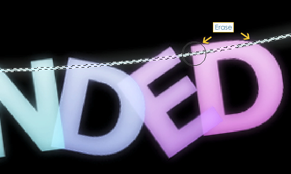 Pick the Eraser Tool, and select the Letters layers, one by one, to erase the outer edges so that the letter looks like its really hung on the Rope.