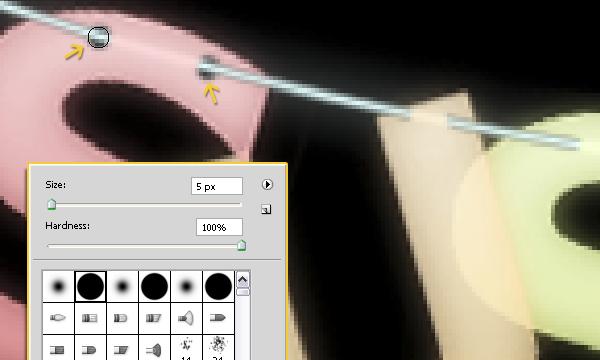 Now choose a hard round brush for the Eraser Tool, set its size to 5 px, and again, select the Letters layers one by one, to erase the parts where the Rope and the Letter meet.