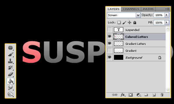 Create a new layer on top of the “Gradient Letters” layer and call it “Colored Letters”, then change its Blend Mode to Screen. Fill the selection you created with the color #ff0000, then press Ctrl + D to get rid of the selection.