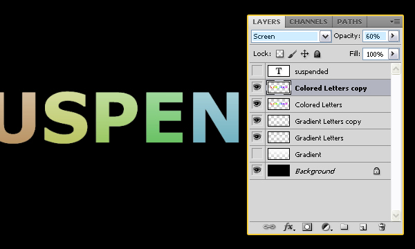 Set the Fill value for both the “Gradient Letters” and “Colored Letters” layers to 60%, and duplicate each one of them.